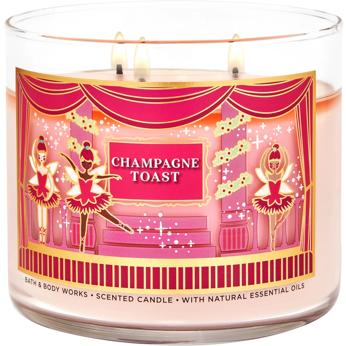 The Bath & Body Works Nutcracker Champagne Toast 3-Wick Candle smells like a fruity, sweet, sparkling spritzer with fragrance notes of bubbly champagne, sparkling berries and sweet orange. Topped with a decorative lid, the Perfect 3-Wick Candle is made using the highest concentration of fragrance oils and an exclusive blend of soy-based wax and wicks that won’t burn out. Like all of our candles, it melts consistently and evenly, radiating enough fragrance to fill an entire room. Burns approximately 25 – 45 hours and measures 4 x 3.5 in.