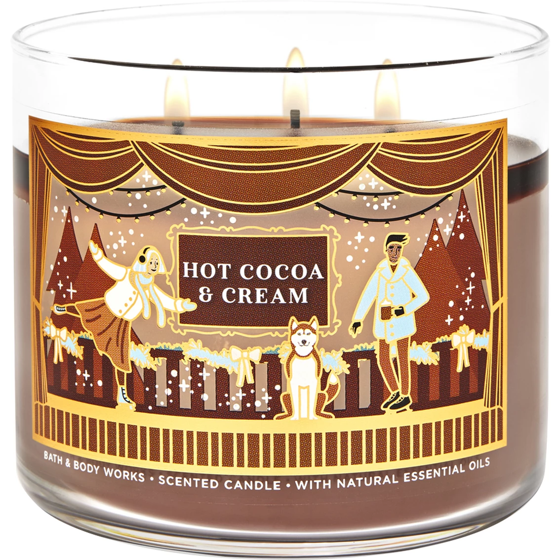 Bath & Body Works Nutcracker Hot Cocoa & Cream 3-Wick Candle smells like a mug of sweet, creamy hot chocolate with fragrance notes of decadent milk chocolate, fresh steamed milk and mini marshmallows. Topped with a decorative lid, the Perfect 3-Wick Candle is made using the highest concentration of fragrance oils and an exclusive blend of soy-based wax and wicks that won’t burn out. Like all of our candles, it melts consistently and evenly, radiating enough fragrance to fill an entire room. Burns approximately 25 – 45 hours and measures 4 x 3.5 in.
