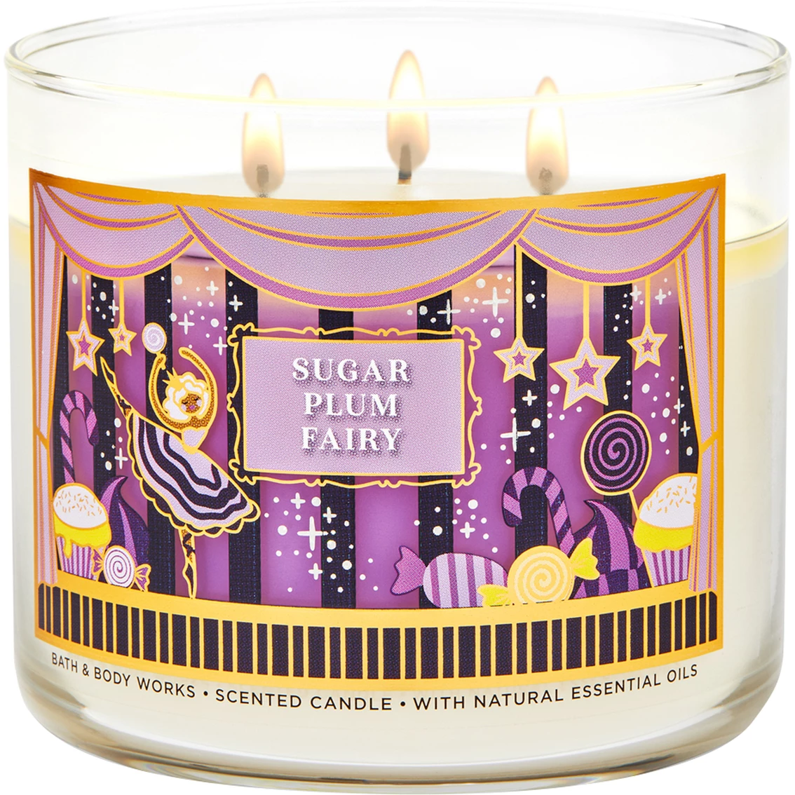 Topped with a decorative lid, the Bath & Body Works Nutcracker Sugar Plum Fairy 3-Wick Candle is made using the highest concentration of fragrance oils and an exclusive blend of soy-based wax and wicks that won’t burn out. Like all of our candles, it melts consistently and evenly, radiating enough fragrance to fill an entire room. Burns approximately 25 – 45 hours. Measures 4-inches wide x 3 1/2-inches tall. Model: 90186.