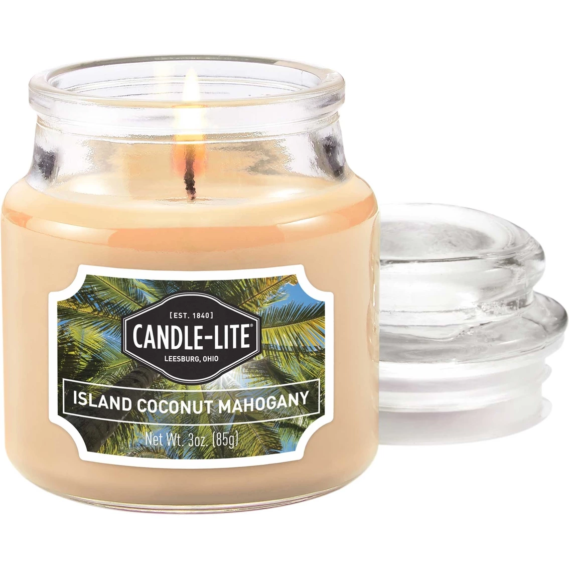 This Candle-lite 3-oz. jar features the scent of Island Coconut Mahogany. Take a sunny walk on the beach with fresh coconut, rare mahogany wood, breezy sandalwood, peach nectar, peony and exotic tiare orchid. The fragrance creates an inviting and fragrant home atmosphere in every room. Model: 4345127.