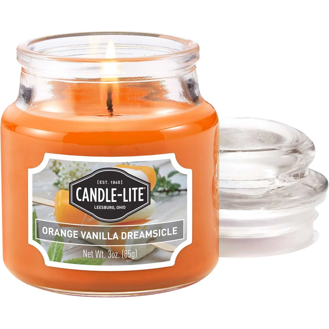 This Candle-lite 3-oz. jar features the scent of Orange Vanilla Dreamsicle. It includes notes of orange zest and peach nectar, combined with vanilla bean, lily petals and white musk. The fragrance creates an inviting and fragrant home atmosphere in every room. Model: 4345132.