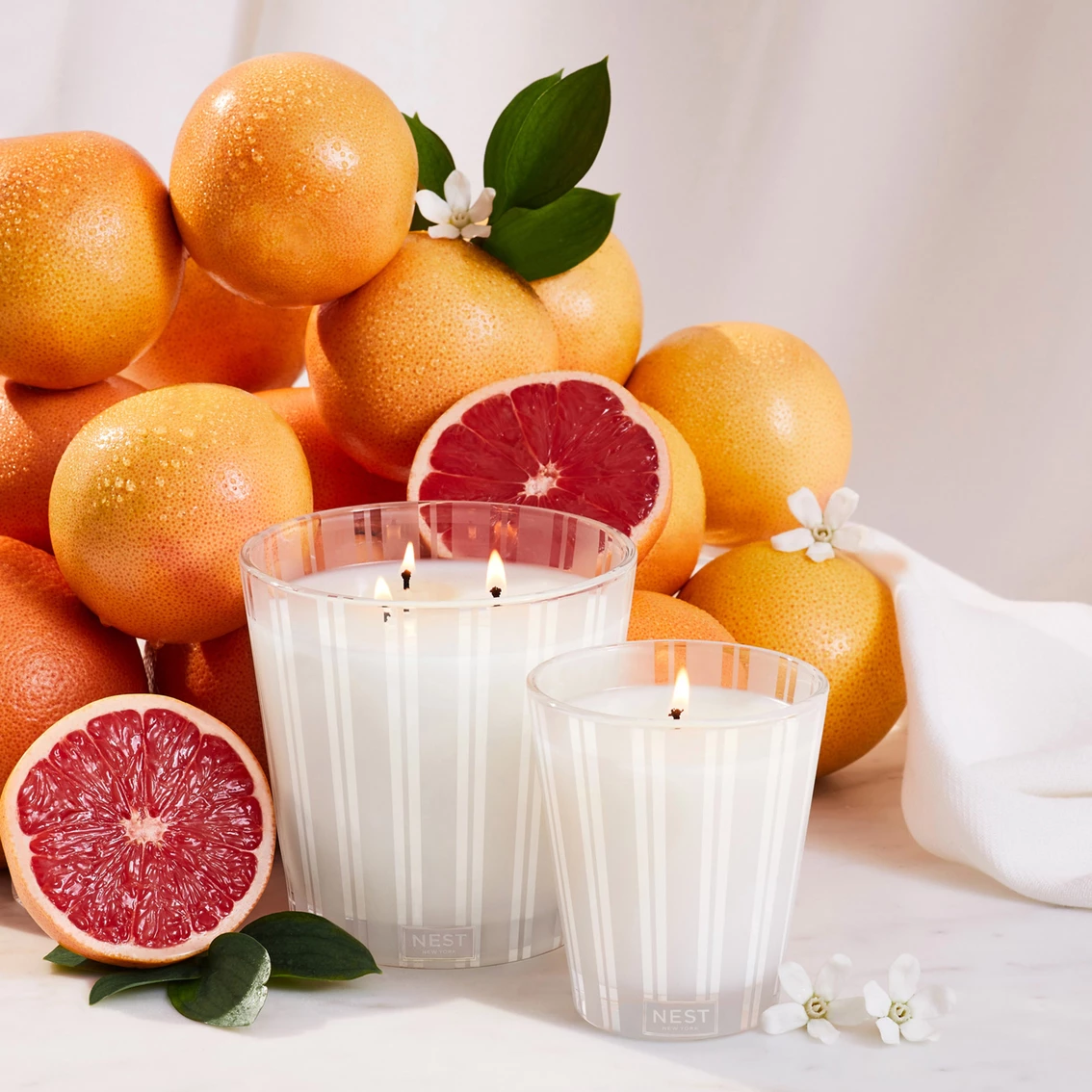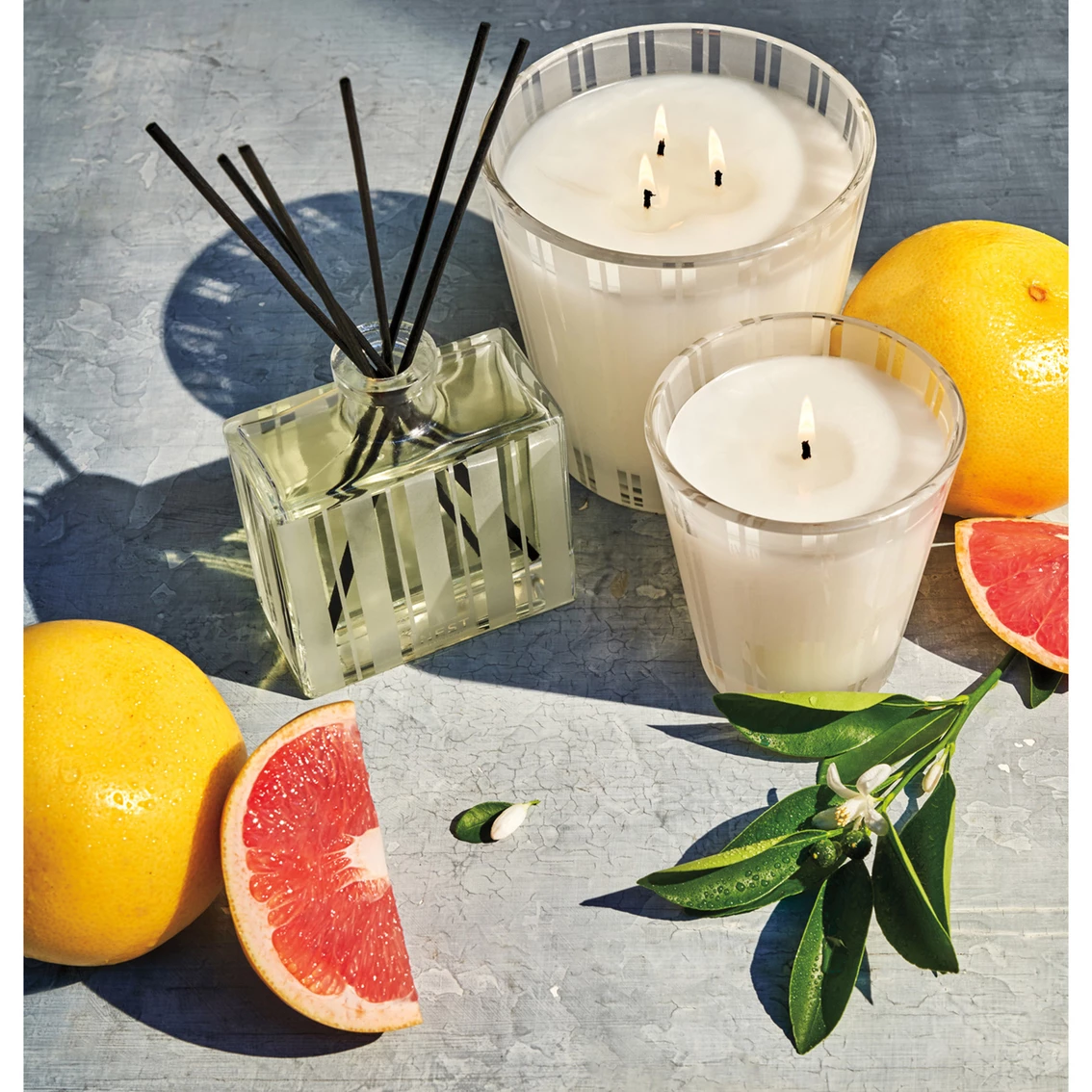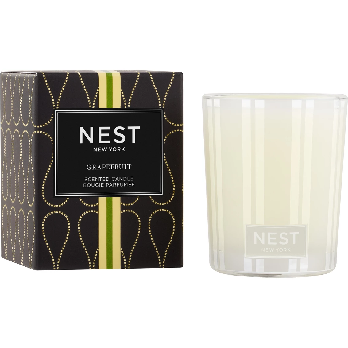 Zesty and effervescent fragrance. Pink pomelo grapefruit and watery green nuances are blended with lily of the valley and coriander blossom. The Nest Fragrances Collection combines color, texture and fragrance to enhance your everyday living and entertaining experience. The glass vases are designed to complement the beauty of its surroundings; the classic shape and modern stripe etching will complement any decor. Each of the fragrances has been created by the most accomplished perfumers at the world’s leading fragrance houses. Nest Fragrances candles are made with a premium, soft, highly refined, cosmetic-grade wax that was developed over many years to optimize burn and fragrance diffusion. The ingredients used are the highest grade of wax materials and the finest fragrance oils available. Nest Fragrances candles are well-known for infusing a room with fragrance. Approximately 20 hrs. burning time. Size: 2 oz.