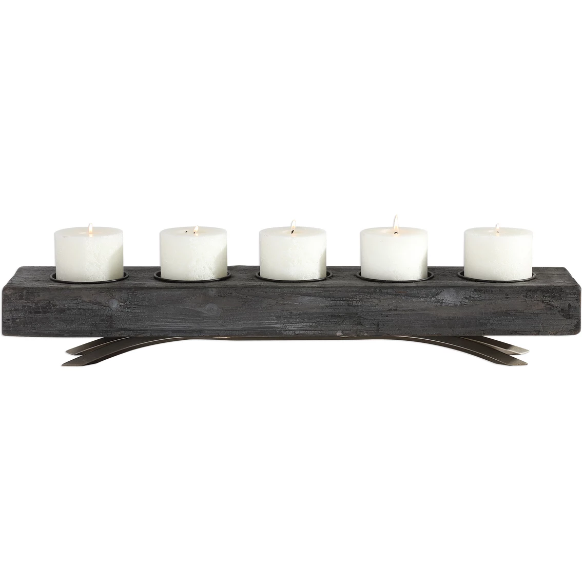 | Fabric Or Material Description | Crackled, aged black wood with recessed candle cups set atop antique silver, arched iron legs, and five, 4"x 3" distressed white candles. |