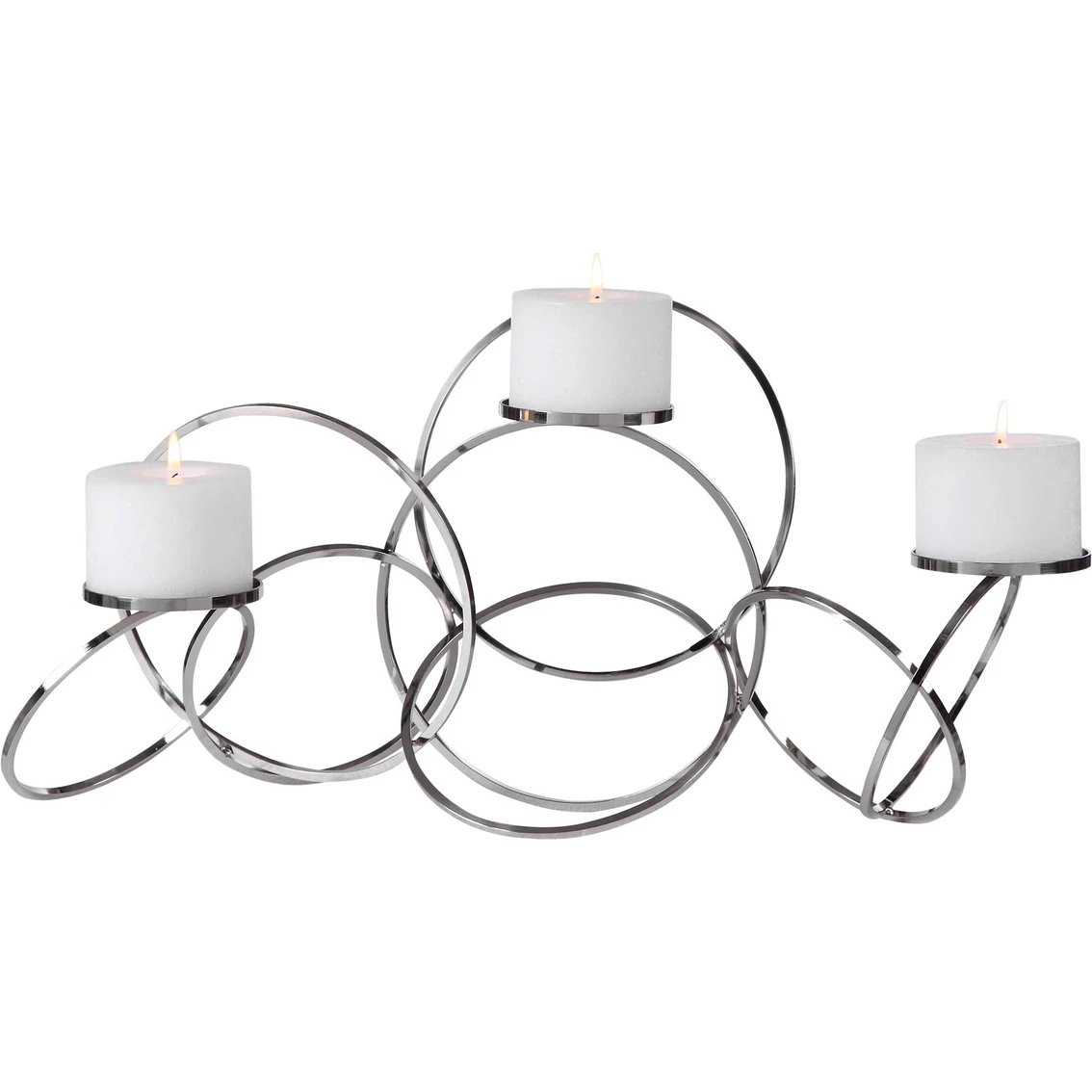 Modern candleholder features an intertwined ring design and is finished in polished nickel. Three 4″x 3″ white candles are included.