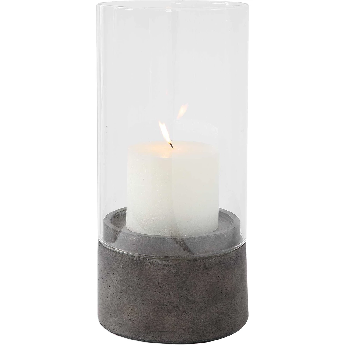 This hurricane candleholder features an antiqued concrete base with clear glass globe and 5 in. x 4 in. distressed off-white candle. suitable for both indoor and outdoor use. Model: 18986.