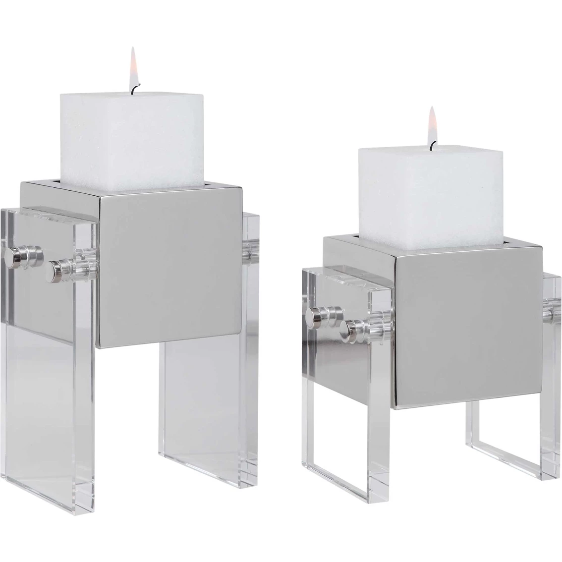 This ultramodern Sutton Square Candleholder Set from Uttermost features two crystal and polished nickel candleholders plus two 3 x 3 in. distressed white square candles. Sizes: small 6 x 7 x 5 in., large 6 x 9 x 5 in. Model: 17742.