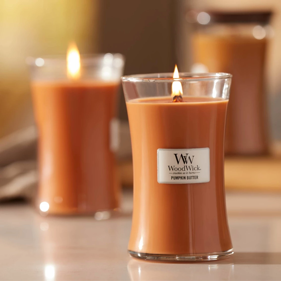Featuring a natural wooden wick that crackles as it burns, this large hourglass Woodwick candle will fill your home with a soft crackling sound and the inviting scent of Pumpkin Butter, a delicious blend of fresh pumpkin, warm spices and sweet buttery notes. The soothing crackle of a WoodWick candle is created by a patented PlusWick Innovation technology, designed to ensure a safe and consistent crackle experience for faster fragrance and a better burn while fragrancing your home with the soothing sound of a crackling fire.