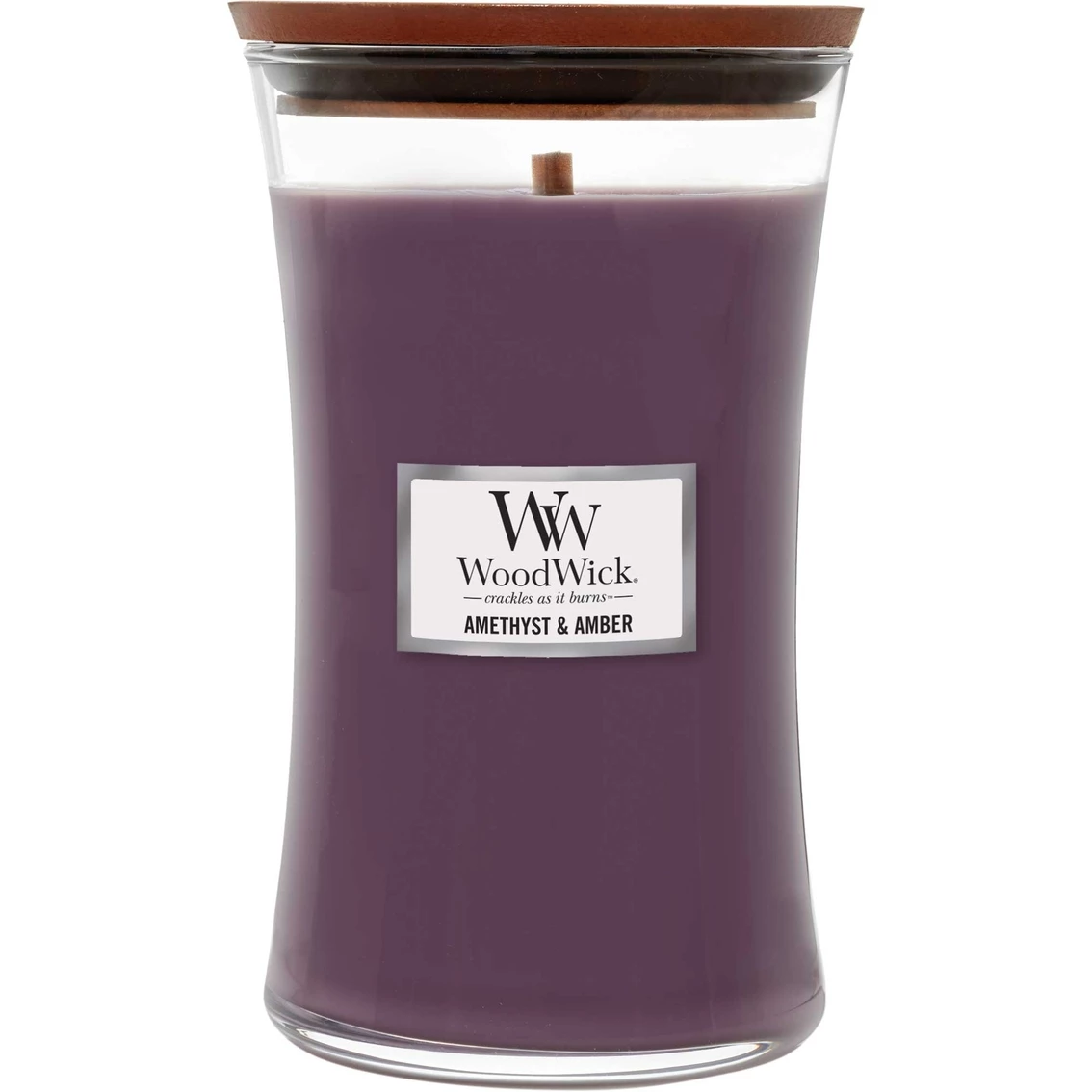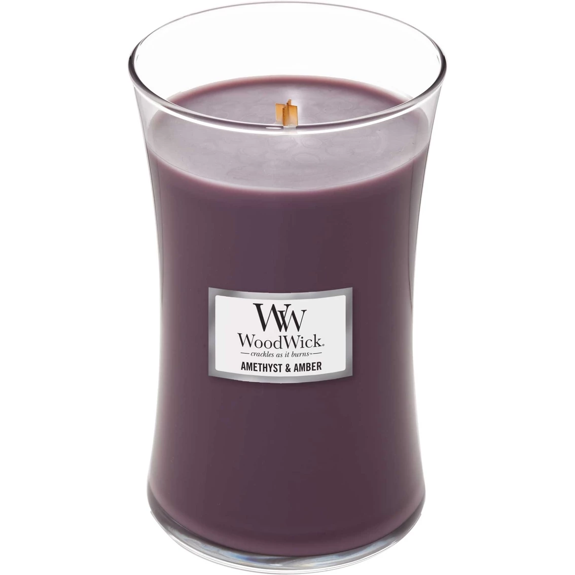 A complex blend of lavender and tuberose scents mix with facets of amber and guaiacwood in the WoodWick Amethyst & Amber Large Hourglass Candle.