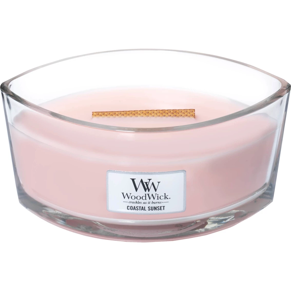 This Coastal Sunset Ellipse Jar Candle from WoodWick offers an aroma of sun-kissed blossoms, inviting coconut nuances and salty ocean air that capture the warm glow of the coast. It crackles as it burns, which helps to create that perfectly relaxing ambiance.