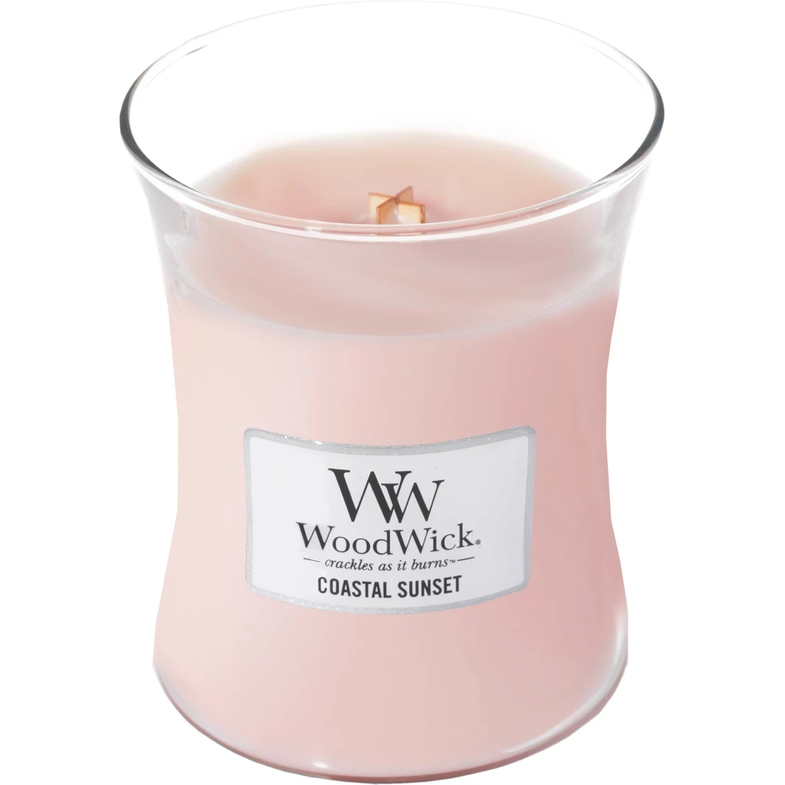 This Coastal Sunset Jar Candle from WoodWick fills your home with a soft crackle as it burns. It offers hints of sun-kissed blossoms, inviting coconut nuances and salty ocean air that capture the warm glow of the coast. Large hourglass candle is 4 x 7 in. Model: 93049.