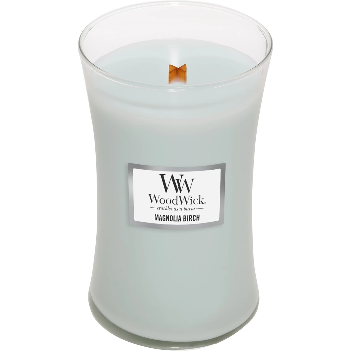The WoodWick Magnolia and Birch Large Hourglass Candle is like a smooth yet bracing blend of magnolia leaf, white birch and winter moss. The Large Hourglass WoodWick Candles fill your home with the soft crackle and inviting scents and a natural wooden wick that Crackles as it Burns. The soothing crackle of a WoodWick candle is created by a patented PLUSWICK technology, designed to ensure a safe and consistent crackle experience for faster fragrance and a better burn while fragrancing your home with the soothing sound of a crackling fire.