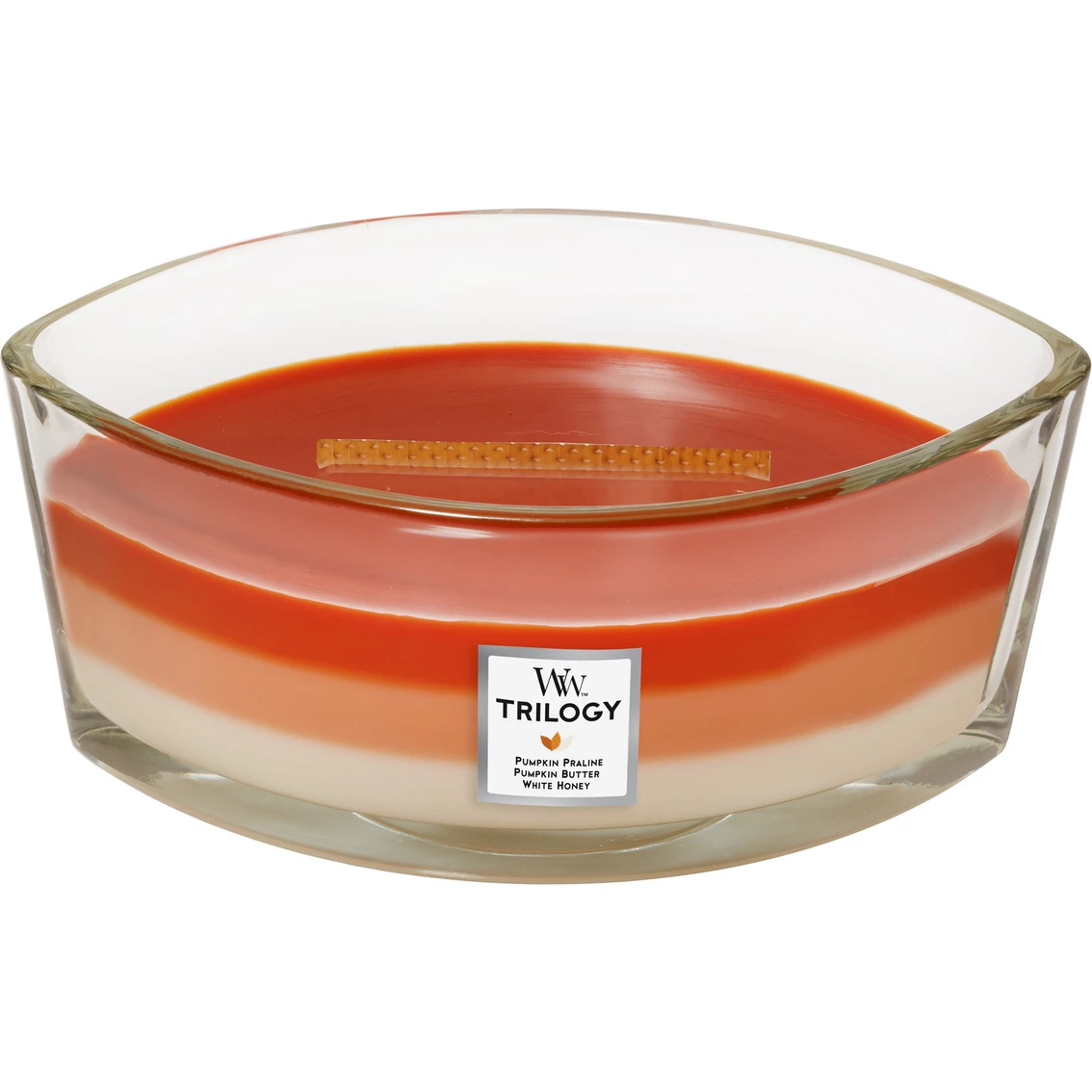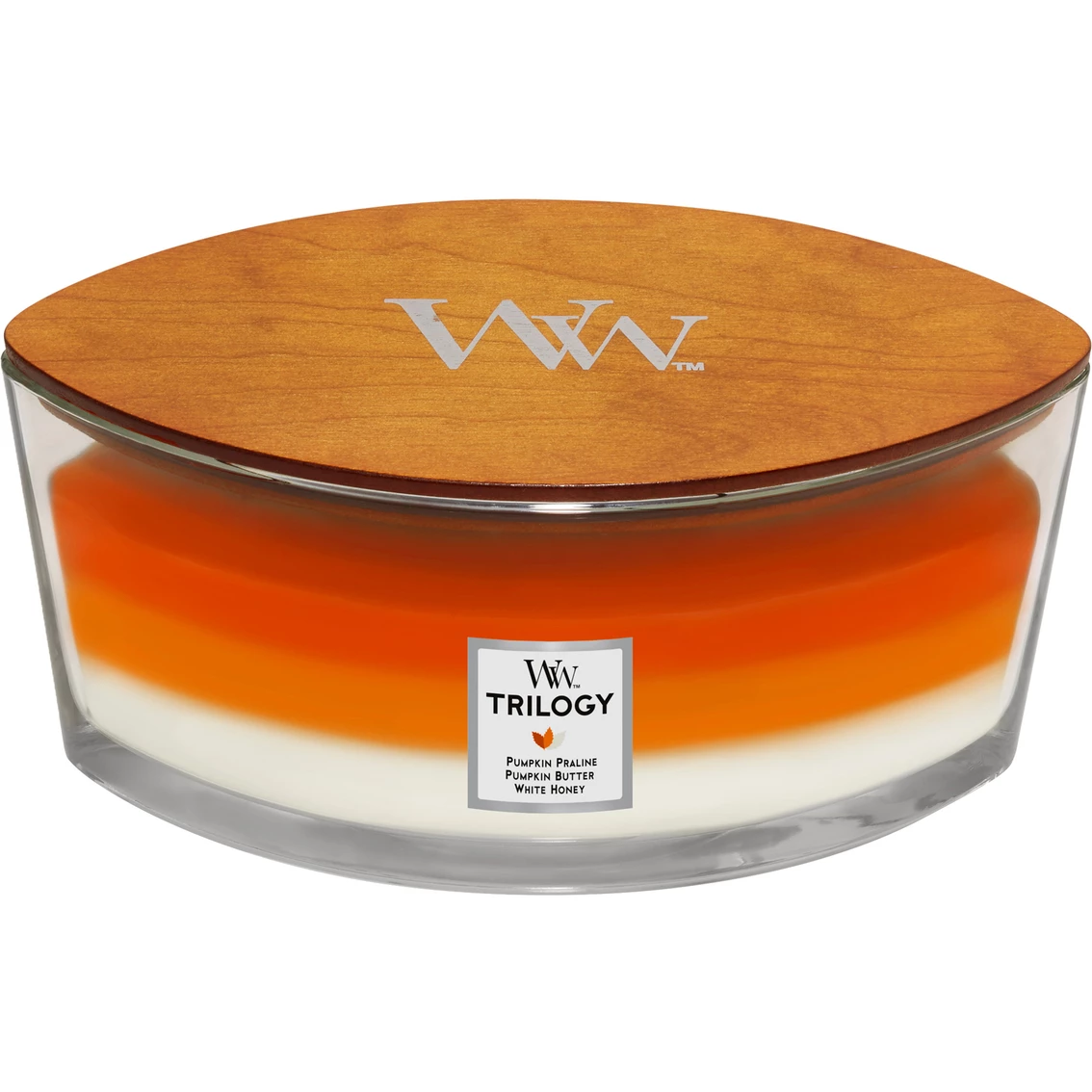 The Woodwick Pumpkin Gourmand Ellipse Trilogy Candle has mixed these scents: