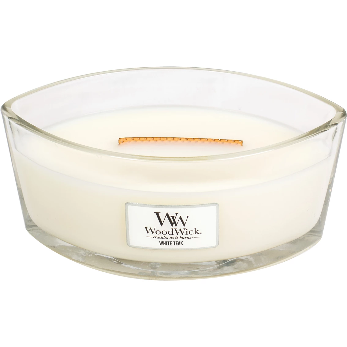 Experience the cozy comfort of a glowing fireplace anywhere in your home. This WoodWick White Teak Ellipse Glass Candle offers a fragrance of crisp balsam branches mixed with sandalwood and oak, with hints of moss-of-tree and cedarwood. The soothing crackle and long, dancing flame of WoodWick with Hearthwick Flame allows you to relive fond memories or create new ones in a warm, comfortable atmosphere. So enjoy more than just a candle, because home is where the hearth is. Model: 76039.