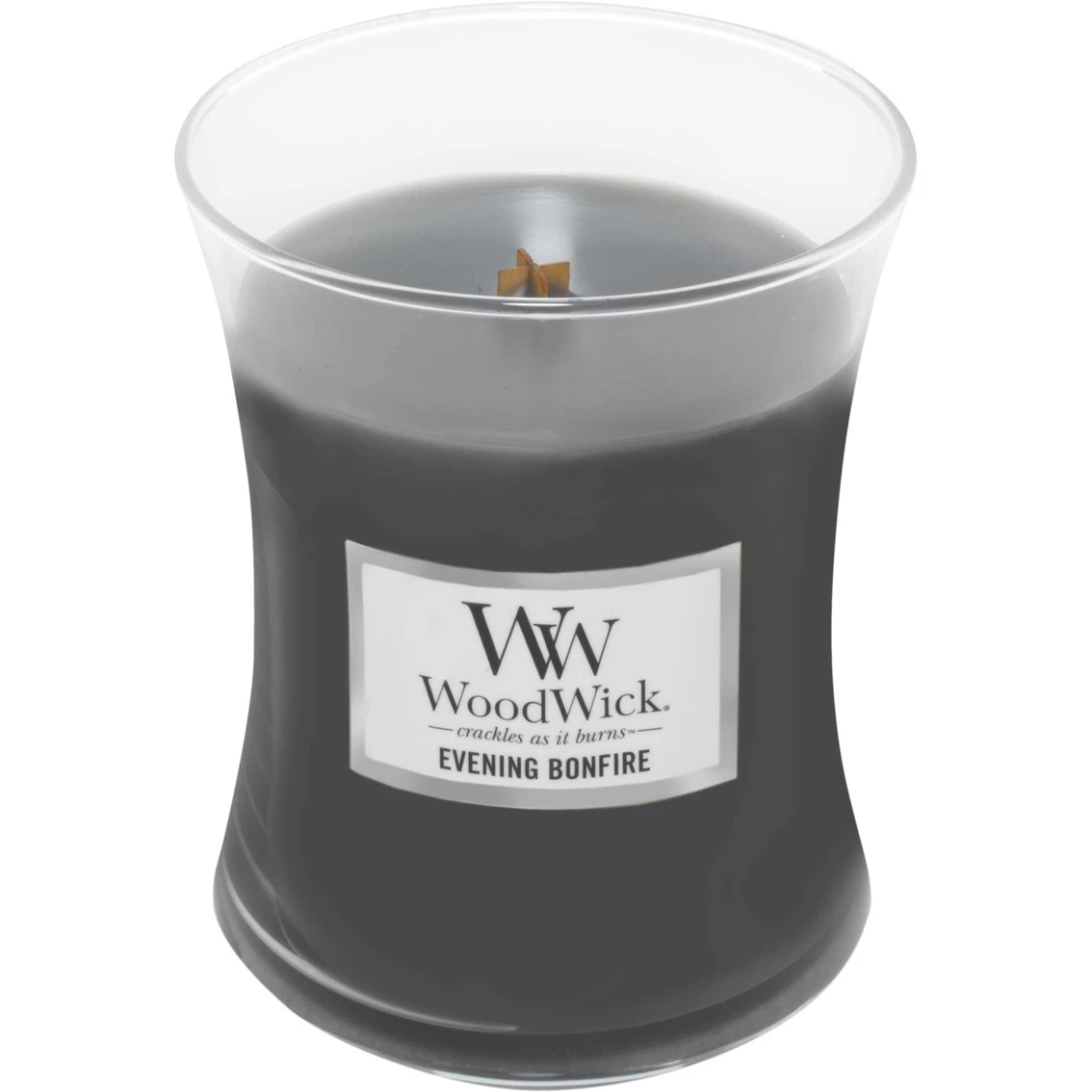 The Evening Bonfire Medium Hourglass WoodWick Candles fill your home with the soft crackle and inviting scents and a natural wooden wick that crackles as it burns. The soothing crackle of a WoodWick candle is created by a patented Pluswick Innovation technology, designed to ensure a safe and consistent crackle experience for faster fragrance and a better burn while scenting your home with the soothing sound of a crackling fire. Model: 92488.