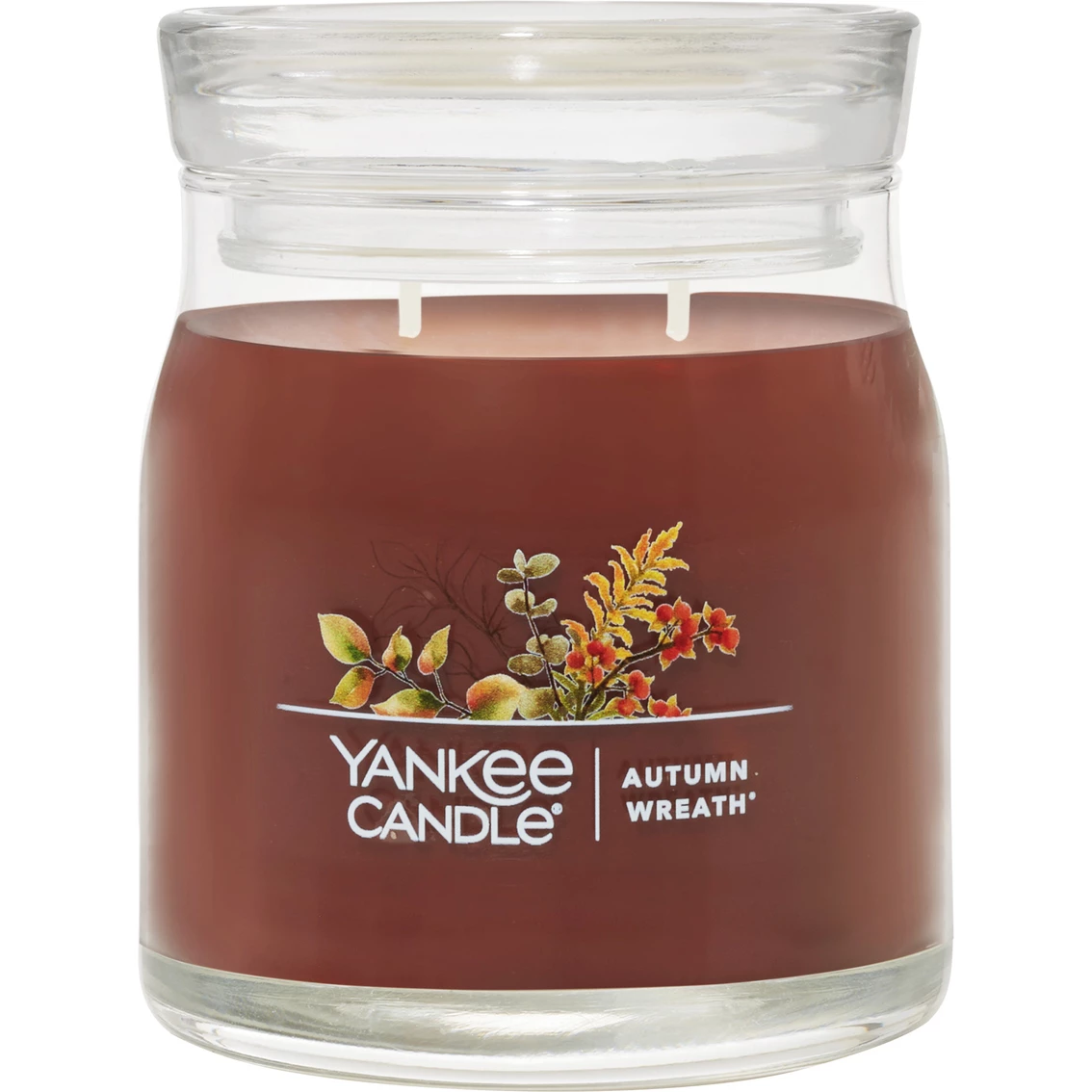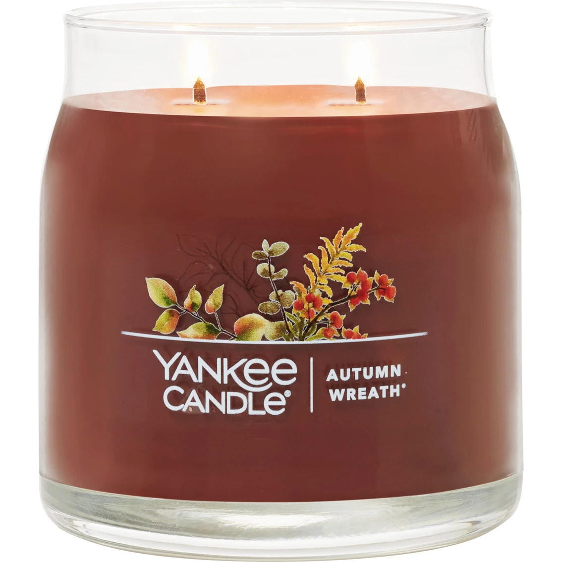 With the Yankee Candle Autumn Wreath Signature Medium Jar Candle there’s a cheerful fall welcome in the spicy warmth of autumn leaves and cinnamon apples. Experience the Yankee Candle brand, totally reimagined. This beautiful take on their iconic Jar shape is designed to create the best burning experience to date. Two cotton wicks and a premium soy-wax blend provide a clean burn. Hand-illustrated labels and vibrant wax colors are perfectly matched with their Collection-exclusive and tried-and-true fragrances to create an inspired addition to your home.
