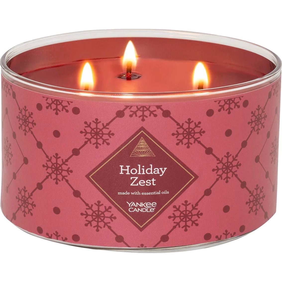 The Yankee Candle Holiday Zest 3-Wick Candle features notes of bright orange zest and candied ginger mingle with sweet vanilla and spicy clove. Yankee Candle’s most popular fragrances, each with a new decorative label, are available for a limited time as giftable candles with embossed metal lids. Three wicks provide a fast wax pool and a generous fragrance throw. Model: 1726327.