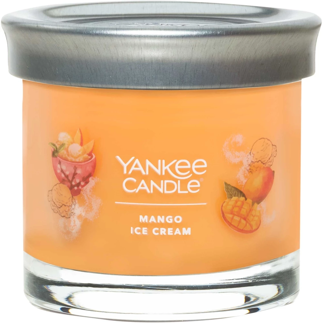 Enjoy a refreshing treat — juicy, sliced mango and vanilla cream — during a picnic party under the cherry blossoms. That’s the aroma of this Mango Ice Cream Signature Small Tumbler Candle from Yankee Candle.