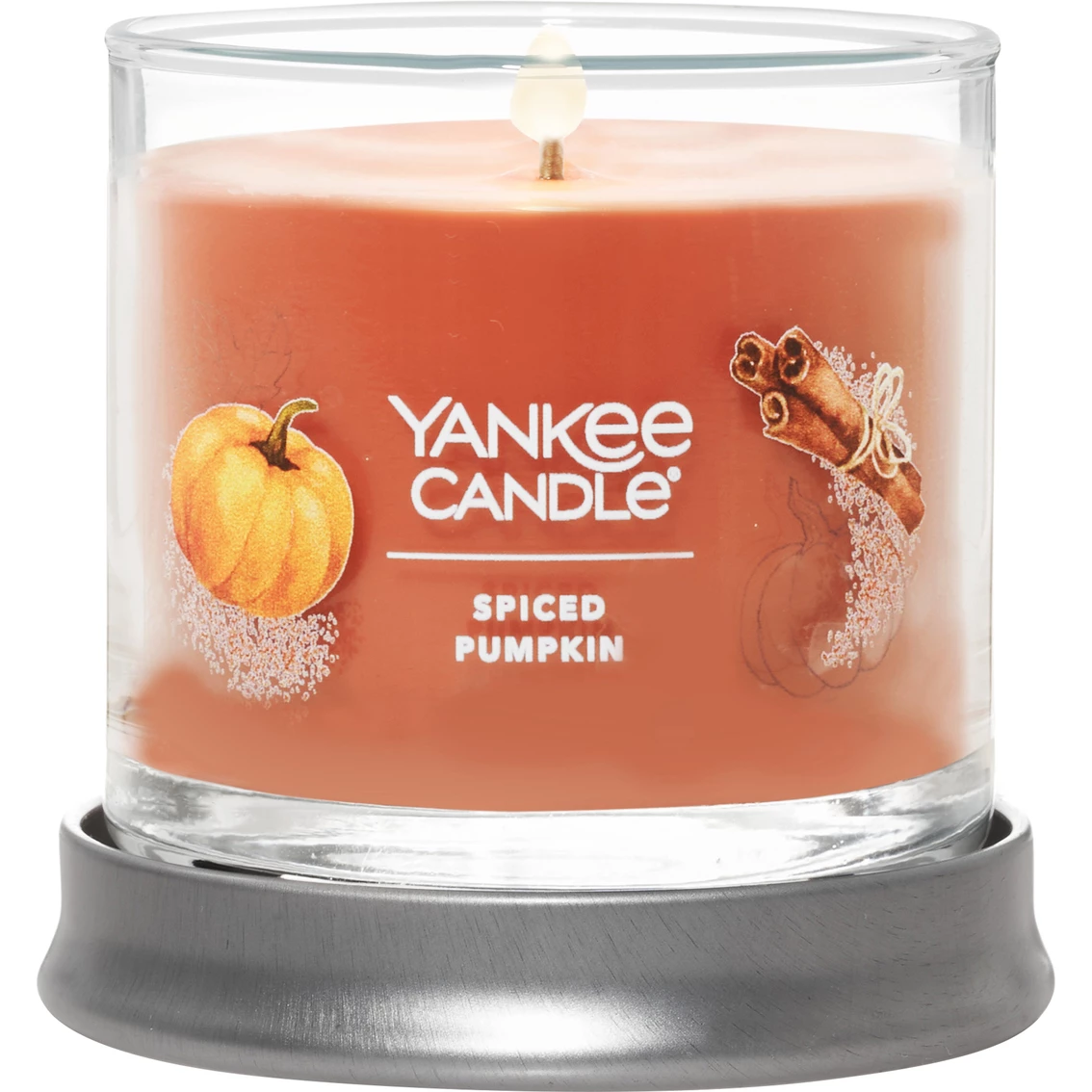 This Yankee Candle Spiced Pumpkin Signature Small Tumbler Candle has the fragrance of pumpkins baked in simmering spices of clove, nutmeg and cinnamon, and sweetened with brown sugar. Style: 1630107.