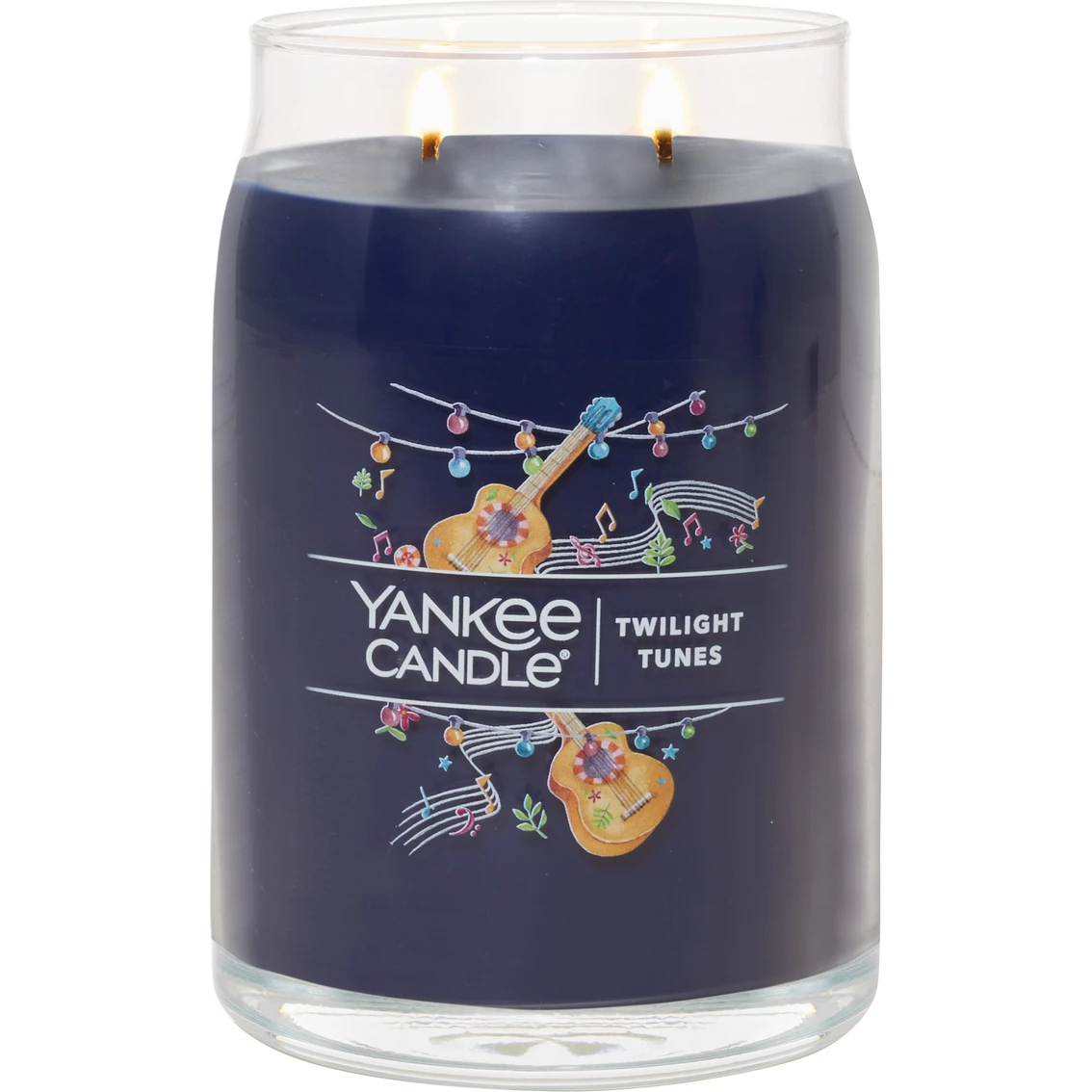 The sounds of live music drift across the festival at twilight, bringing scents of cardamom, aquamarine and woody notes in the Yankee Candle Twilight Tunes Signature Large Jar Candle.